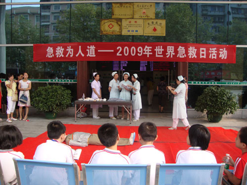 世界急救日宣傳活動 發(fā)布時間:2009年9月15日 預(yù)覽:4234次 值第五個“世界急救日”來臨之際,為彰顯我市120急救中心在我院的社會職能,提高衡陽市廣大市民急救意識,普及急救知識,讓更多的社會人士掌握急救技能,在事發(fā)現(xiàn)場挽救生命和降低傷害程度。在護理部策劃下,急診科于2009年9月12日上午在門診大樓前坪向全體市民舉辦了“急救為人道”的社會公益活動。四名急診??谱o士現(xiàn)場演示急救技能操作(徒手心肺復(fù)蘇、簡易固定、止血包扎、氣管異物排除等),多名觀眾主動上臺學(xué)習(xí)急救技能操作。歐陽茴香主任用通俗易懂的方式解答市民提出的急救問題,工會還準(zhǔn)備精美小禮品發(fā)給參與有獎問答的觀眾,1000本常用急救手冊發(fā)放一空,現(xiàn)場氣氛輕松活躍。成章小學(xué)張校長聞訊帶領(lǐng)全體老師大早來到醫(yī)院,自己也學(xué)的非常認真,他說“香港小學(xué)要求學(xué)生人人掌握徒手心肺復(fù)蘇,以備不時之需,回去我們要全員培訓(xùn),非常感謝貴院給我們提供了這些知識?!?自2005年開始,紅十字會與紅新月會國際聯(lián)合會將每年9月的第二個星期六定為 “世界急救日”。 護理部 來臨