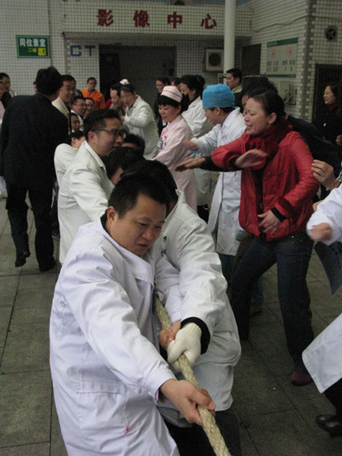 中心醫(yī)院積極倡導(dǎo)運(yùn)動(dòng)防病 發(fā)布時(shí)間:2009年11月13日 預(yù)覽:3538次 中心醫(yī)院積極倡導(dǎo)運(yùn)動(dòng)防病 在全民狙擊甲型H1N1流感病毒的季節(jié),衡陽市中心醫(yī)院身體力行“現(xiàn)身說法”,積極倡導(dǎo)通過科學(xué)運(yùn)動(dòng)提高健康素質(zhì),增強(qiáng)肌體防病抗病能力。繁忙的醫(yī)療工作之余,他們組織員工開展拔河、乒乓球賽、登高等運(yùn)動(dòng)。圖為11月13日,該院醫(yī)護(hù)人員開展拔河活動(dòng)和在門診大樓舉行“挑戰(zhàn)21層”爬樓比賽情景。(鄒建軍)
