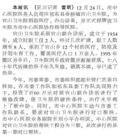 “攜”著官山衛(wèi)生院走“三步” 發(fā)布時(shí)間:2010年12月30日 預(yù)覽:3190次 市中心醫(yī)院開展對(duì)口幫扶 “攜”著官山衛(wèi)生院走“三步” 摘自《衡陽日?qǐng)?bào)》12月28日