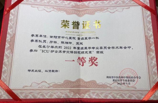重癥醫(yī)學一科在省級護理競賽中獲一等獎 發(fā)布時間:2022年07月11日 09:35:17 預覽:4024次 重癥醫(yī)學一科通訊員丁玲報道:7月9日,衡陽市中心醫(yī)院重癥醫(yī)學一科,在長沙舉辦的2022年重癥醫(yī)學專業(yè)委員會學術年會,參加“ICU護士床旁交接班視頻競賽”中榮獲一等獎!本次競賽旨在加強臨床護理核心制度的落實,規(guī)范重癥患者床旁交接流程,進一步提升重癥專科護士的實踐能力,減少交接班遺漏帶來的不良影響。通過專家評選打分并同步開展網(wǎng)絡同行互評打分的評分標準,在全省56個參賽視頻作品中,我院重癥醫(yī)學一科在厲璐護士長帶領陳湘玲、王歡組成參賽團隊,以主題鮮明、流程完善、視角深度貼合重癥護士床旁交接的作品,經(jīng)過激烈角逐,脫穎而出獲得一等獎。