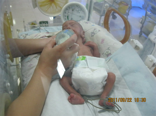 9月4日中午,懷孕只有26周的河北籍尹女士乘坐火車途經(jīng)耒陽時突然臨產(chǎn),于是趕緊下車并被火速送到耒陽市市人民醫(yī)院。當(dāng)天下午,尹女士順利生下一男嬰。由于早產(chǎn),這名嬰兒出生時體重不足1000克,全身青紫、呼吸極為微弱、生命力非常低下,情況十分危急。5日凌晨,衡陽市中心醫(yī)院兒接到緊急求援電話,立即派專車將嬰兒轉(zhuǎn)運(yùn)過來。
