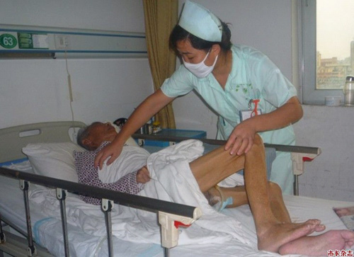 讓王先生更感動(dòng)的是,曾春秀和呼吸內(nèi)科全體醫(yī)護(hù)人員將近兩個(gè)月來對(duì)其父親王爺爺?shù)恼樟?。他說,特別要感謝曾護(hù)士,她不嫌臟不怕累的精神值得表?yè)P(yáng)。王爺爺同時(shí)患有左側(cè)股骨粉碎性骨折,醫(yī)院采取骨牽引治療方法在他的腿部打入鋼釘,每次護(hù)理的時(shí)候曾春秀都小心翼翼,盡量減輕骨折創(chuàng)口的疼痛。由于長(zhǎng)期臥床王爺爺又患上3級(jí)褥瘡,剛轉(zhuǎn)入呼吸內(nèi)科的時(shí)候,他的臀部已經(jīng)有了一個(gè)拳頭大小的褥瘡開始惡化,曾春秀堅(jiān)持每天兩次給病人擦洗臀部并換藥,每個(gè)小時(shí)給他翻身一次,經(jīng)過10多天的精心護(hù)理,王爺爺?shù)娜殳彵阃耆狭恕?/p>