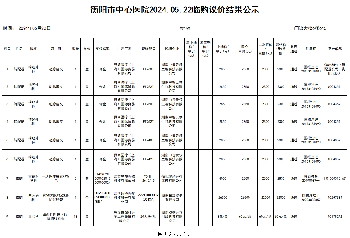 衡陽(yáng)市中心醫(yī)院2024.05.22臨購(gòu)議價(jià)結(jié)果公示