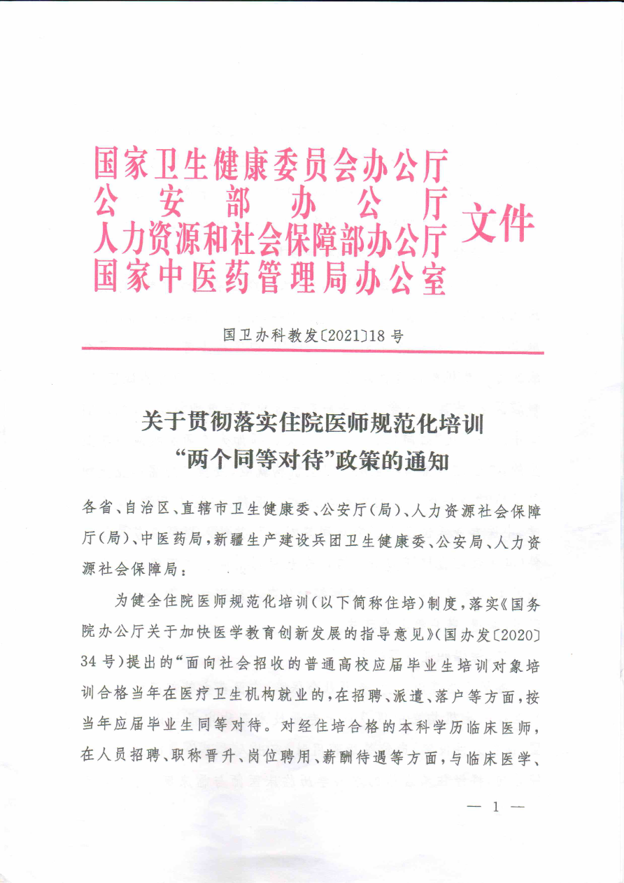 關(guān)于貫徹落實(shí)住院醫(yī)師規(guī)范化培訓(xùn)“兩個(gè)同等對待”政策的通知 發(fā)布時(shí)間:2024年07月04日 08:46:24 預(yù)覽:2373次