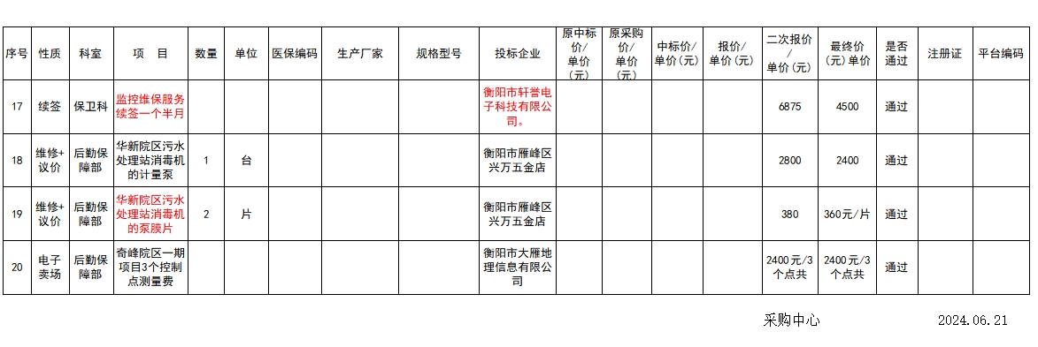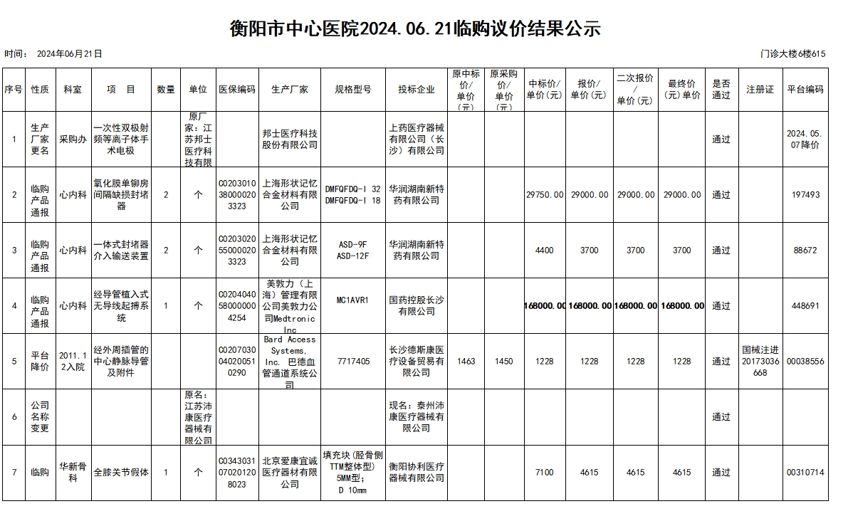 衡陽市中心醫(yī)院2024.06.21臨購議價結(jié)果公示