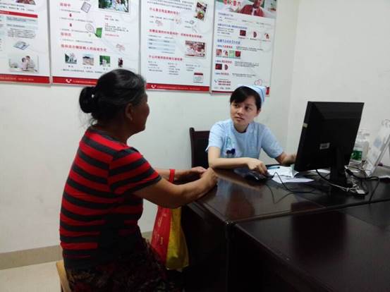 內(nèi)分泌科護(hù)士長(zhǎng)劉丹在健康教育綜合內(nèi)科門(mén)診室耐心接受糖尿病患者的咨詢(xún)