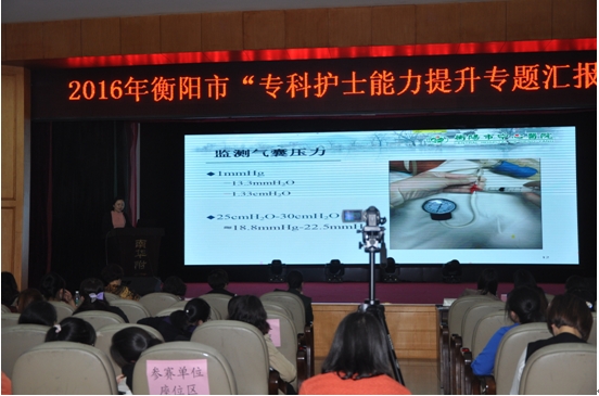 4月15日下午,衡陽市衛(wèi)計(jì)委聯(lián)合市護(hù)理學(xué)會(huì)舉辦了2016年衡陽市首屆“??谱o(hù)士能力提升專題匯報(bào)競(jìng)賽”。比賽現(xiàn)場(chǎng),來自省市直三級(jí)醫(yī)院的24名選手,精彩演講,激烈角逐。經(jīng)過長(zhǎng)達(dá)4個(gè)小時(shí)的比拼,我院神經(jīng)外科護(hù)士長(zhǎng)唐婧以《氣管切開患者的氣道濕化改良技術(shù)》為主題,用精彩的PPT演講征服了評(píng)委,脫穎而出,榮獲衡陽市市級(jí)醫(yī)院組一等獎(jiǎng)殊榮。
