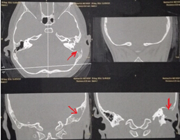 該患兒既往無中耳炎及耳流膿病史,僅表現(xiàn)為1個月前耳后稍有紅腫、疼痛,在當(dāng)?shù)蒯t(yī)院曾被診斷為“蚊蟲咬傷”所致,家長也未引起足夠的重視。近半月來,患兒耳后紅腫疼痛加重,遂到我市某三甲醫(yī)院就診,行高分辨率中耳乳突CT,發(fā)現(xiàn)側(cè)顱底、中耳乳突腔巨大新生物占位,乳突骨皮質(zhì)破壞吸收,并可疑耳后骨膜下膿腫形成。病情若進(jìn)一步發(fā)展,膽脂瘤破壞顱底骨質(zhì),將極有可能并發(fā)腦膜炎、腦膿腫,甚至出現(xiàn)敗血癥、腦疝等,危及生命。