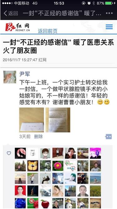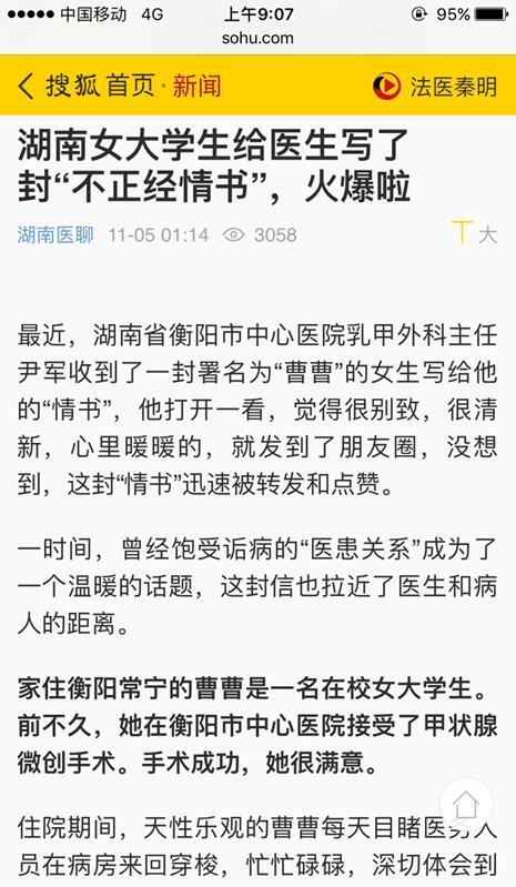 近日有一封患者寫給醫(yī)生的“不正經(jīng)情書”意外在網(wǎng)絡(luò)走紅,今日頭條網(wǎng)、搜狐網(wǎng)、騰訊網(wǎng)、網(wǎng)易、護(hù)士網(wǎng)等國(guó)內(nèi)主流媒體報(bào)道后引來幾十萬的閱讀量!