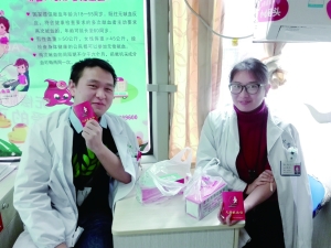 手拿獻(xiàn)血證的兩名呼吸內(nèi)科年輕醫(yī)生合影
