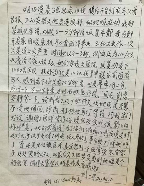 一封老人的感謝信 發(fā)布時(shí)間:2018年5月4日 預(yù)覽:11205次 5月4日上午,一位退休老人步履艱難地來到門診辦公室,述說了他前幾天來門診看病的感動(dòng)。他遞上感謝信后一再叮囑要求門診負(fù)責(zé)人給予表揚(yáng),述說時(shí)還熱淚盈眶。下面老人家寫給神經(jīng)內(nèi)科門診醫(yī)師丁菁主任的信: 劉一平老人不辭辛苦,病情好轉(zhuǎn)后特地趕來醫(yī)院門診向4月28日看門診的丁菁主任表示感謝。