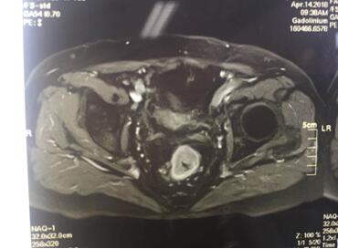 入院后譚曙光主任帶領賀賽奇副主任、周高副主任醫(yī)師及周平主治醫(yī)師等科室業(yè)務骨干為汪老制定詳細診療計劃。術前盆腔MRI及腸鏡、病理診斷考慮低位直腸腺癌(T3aN0M0)。鑒于汪老年老體弱,病變位置低,基礎疾病多,耐受力較差,譚主任及其手術團隊精益求精,不斷完善診療措施,術前采取MDT(多學科合作)模式,于4月18日在全麻腹腔鏡下行直腸癌根治術+D3淋巴結清掃術+粘連松解,手術順利,術中徹底松解腹腔內粘連,標準的TME(直腸全系膜切除)及D3淋巴結清掃,腹腔鏡下吻合口加固縫合,手術出血僅30ml,在原有的手術切口處取出手術標本。