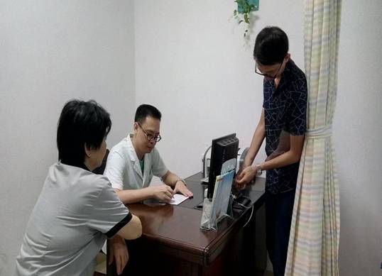 2、二樓服務(wù)臺(tái)分診后,醫(yī)師通過(guò)問(wèn)診為病人開(kāi)出手工處方。