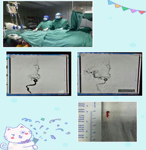 神經(jīng)內(nèi)科再次成功取栓 發(fā)布時間:2018年11月19日 12:05:47 預(yù)覽:2605次 通訊員劉巧報(bào)道:2018年11月14日凌晨6:09分,神內(nèi)一區(qū)收治一名急性腦梗死患者,病人是一名68歲女性,頭痛伴左側(cè)肢體偏癱3小時,頭顱CT未見出血,NIHSS評分12分,診斷為急性右側(cè)大腦半球梗死。 丁菁主任考慮目前患者發(fā)病在急性靜脈溶栓治療窗內(nèi),排除靜脈溶栓禁忌癥,與家屬交代病情并告知可行靜脈溶栓和取栓治療,家屬考慮風(fēng)險后同意立即予以阿替普酶靜脈溶栓拒絕取栓治療??墒腔颊咴谌芩ㄟ^程中左側(cè)肢體肌力仍為0級,并且左眼瞼有少許出血現(xiàn)象,劉禮泉主任果斷判斷為大血管閉塞決定橋接取栓,并再次與病人家屬建議、溝通、簽字,最大程度縮短了發(fā)病至手術(shù)時間。 此時在門診坐診的曾比賢副主任趕回病房與家屬交流,帶患者去CT室行頭頸聯(lián)合CTA,結(jié)果顯示右側(cè)大腦中動脈M1段急性閉塞,立即護(hù)送患者入介入室,請血管介入科孫智文醫(yī)生協(xié)助,經(jīng)歷一個小時的艱苦奮戰(zhàn),成功取栓造影、顱內(nèi)動脈取栓術(shù),堵在血管內(nèi)的栓子被成功取出。