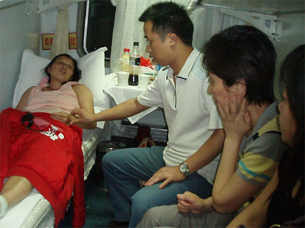 6月18日,市中心醫(yī)院院長申錦林教授帶領該院心臟中心和腦科中心學科負責人乘坐N605次列車赴廣東省人民醫(yī)院參加一個學術活動。下午2時,當列車即將行駛到韶關車站時,列車廣播突然喊話:“15號車廂有乘客病重,車上如有醫(yī)生,請速到現(xiàn)場?!鄙赍\林院長聽到后,立即安排心血管內(nèi)科博士蔣路平和醫(yī)務部部長唐業(yè)華趕去救援。由于當次列車乘客特別多,走道上擠滿了人,加上天氣悶熱,專家們在穿越了十幾節(jié)車廂時非常費勁。二十分鐘后,當專家們到達15號車廂時,衣服已被汗水濕透。乘客們看見專家來了,迅速騰出空間。專家們發(fā)現(xiàn),患病男子年約30多歲,臉色蒼白,大汗淋漓,呻吟不止。經(jīng)過診斷,專家們認為該男子是胃潰瘍引發(fā)絞痛,便立即實施簡單的手法治療和藥物治療,半個小時后,病人轉危為安,連聲道謝。