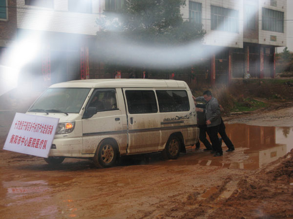 飯后接著去第二個目的地黃土鋪壽嶺村,這里是狹長地帶,路途遙遠(yuǎn),山路崎嶇,由于大部分路段改修國道,原有的道路雨后路面凹凸不平,積水的路面難料深淺,車行進中不時底盤碰出響聲,有時還深陷泥里難以開出,從去到返回,兩次排汽筒進水熄火,隊員們只好都下來推車,更顧不上一身泥水,由于行走在轉(zhuǎn)彎抹角、坑洼不平的路上,車內(nèi)人貨混裝,人員相對擁擠,有的隊員淋雨后頭暈?zāi)X脹,兩位隨行的護士嘔吐不止,當(dāng)看到村民從四面八方趕來的場景,隊員們克服各種困難馬上就投于到義診,開始村民還不能理解,以為只是來走過場,有個別人還有牢騷,當(dāng)看到醫(yī)務(wù)人員誠心盡力為村民看病后,還免費發(fā)藥給他們,他們才釋言贊揚:“我們能得到城里大醫(yī)院專家治療實在難得”。