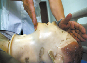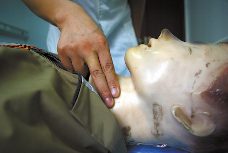 “確定患者昏迷后,我們需要再進(jìn)一步判斷?!睔W陽(yáng)茴香說(shuō),我們可用兩指貼于跌倒者的頸部動(dòng)脈,看看是否有心跳,然后再看看其是否有呼吸。