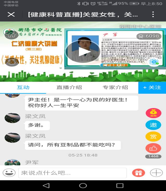 仁濟健康大講堂在華新院區(qū)開講了 發(fā)布時間:2018年5月29日 預覽:2504次 通訊員楊柳報道:5月25日,市中心醫(yī)院仁濟健康大講堂第3期在華新院區(qū)開講。本期大講堂特邀乳甲外科尹軍主任以《關愛女性健康遠離乳腺疾病》為題,為患者及家屬講解乳腺癌的預防和治療。該講堂用圖文并茂的形式,深入淺出地為大家普及醫(yī)療知識,風趣的授課方式吸引了100余名市民朋友和患者到場聽課,現(xiàn)場還通過微信進行了網(wǎng)絡直播。 課堂開始從流行病學角度以通俗易懂的語言和圖片向聽眾介紹了乳腺癌在我國的發(fā)病情況,逐層深入地介紹如何從病因進行預防。隨后,現(xiàn)場指導大家如何自己在家中進行簡單的體查,并告訴大家隨著醫(yī)學科學的發(fā)展和治療手段的改進,惡性腫瘤的治愈率不斷提高,希望通過本次講堂讓更多患者和家屬更加清晰地認識到乳腺癌的發(fā)生與發(fā)展,幫助患者掃除疑慮,積極治療,為大家普及健康知識。課后大家在課堂上就自身遇到的問題積極提問,尹主任一一作了詳細的回答。 《仁濟健康大講堂》是市中心醫(yī)院內(nèi)部各科室專家聯(lián)動舉辦的系列課程,科普講座以服務患者,提高健康知識知曉率,提高全民健康素養(yǎng),讓更多百姓受益。是醫(yī)院公益性的一項工作。醫(yī)院努力創(chuàng)造出一種人文化就醫(yī)環(huán)境,一切以患者為中心,在疾病治療進程中,醫(yī)患關系更加融洽,高效、優(yōu)質(zhì)地為病友提供診療服務。 仁濟直播間在線互動答疑 仁濟大講堂現(xiàn)場