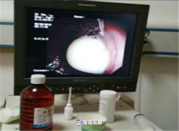 進(jìn)鏡至乙狀結(jié)腸(約距肛門20cm)處發(fā)現(xiàn)存留在患者腸道內(nèi)的異物,為一乳白色、表面光滑、具有彈性的異物。